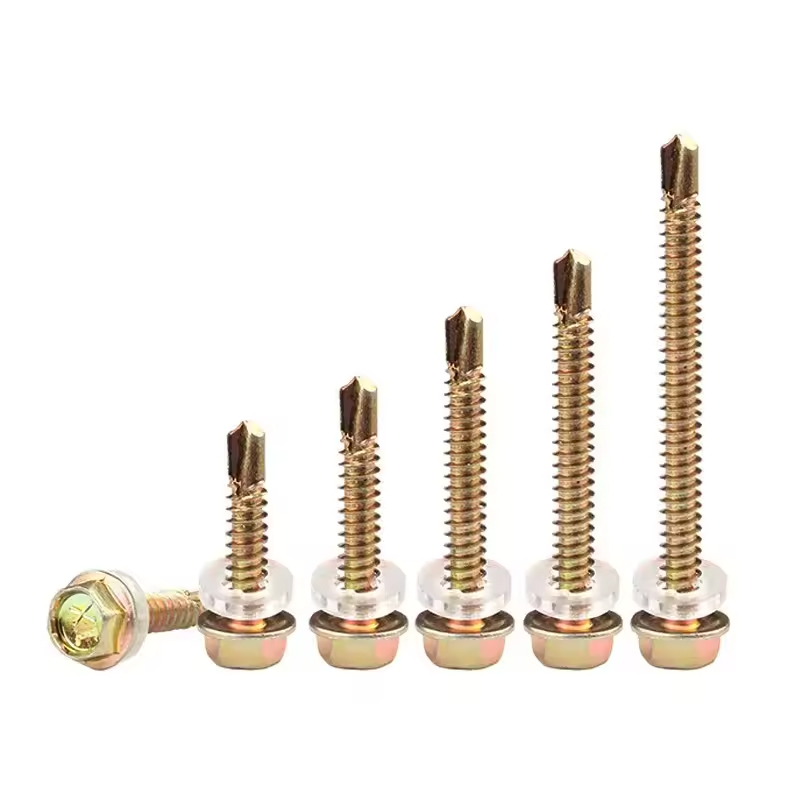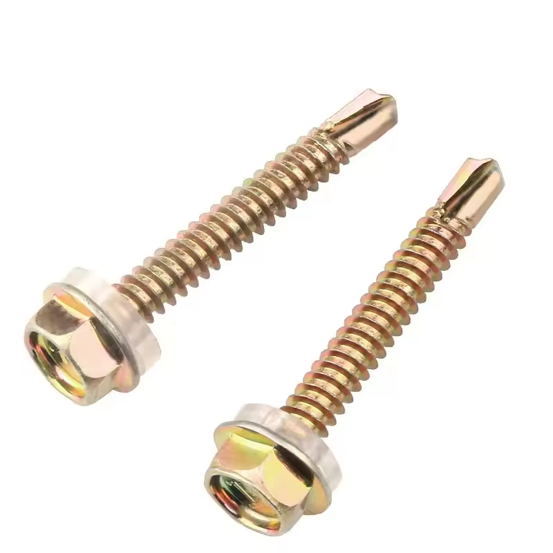 Self-drilling hex head screws have a hex head that can be driven by a socket or tool. These screws use its self-drilling (TEK) tip to tap their own holes in 20 to 14 gauge metals. Particularly in wood, their threads also enlarge the substance to improve retention. The larger the drill tip to pierce heavier gauge metals, the higher the TEK number. Depending on the screw size, the heads employ a 1/4, 5/16, or 3/8 hex nut driver. These screws are employed in outdoor environments.
